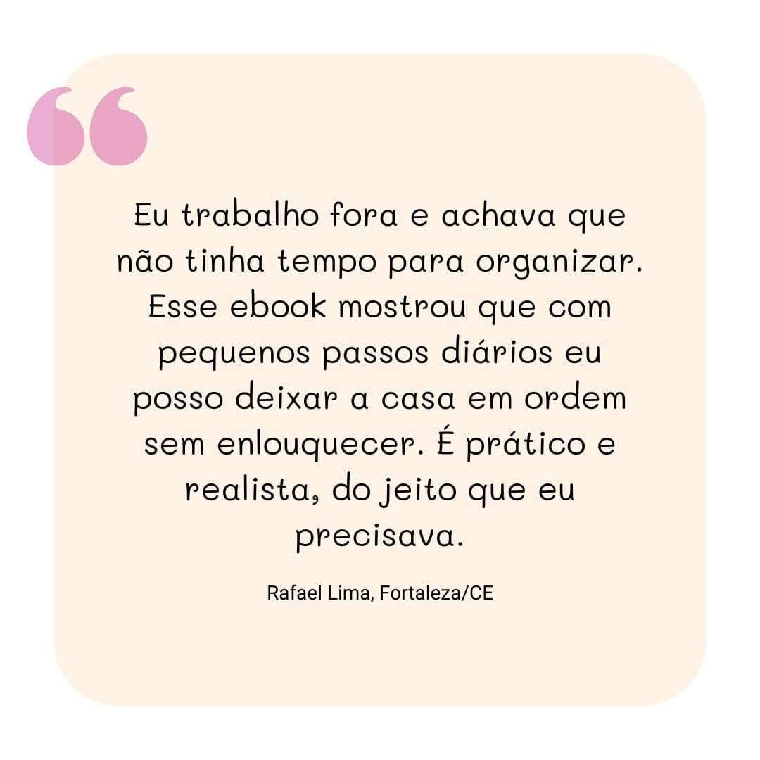 Chega de Bagunça não é mais um manual teórico — é um guia prático, passo a passo, pensado para que você veja resultados reais desde o primeiro dia. Com dicas simples, aplicáveis na rotina corrida, você vai conseguir transformar seu lar em um espaço que acolhe, sem cobranças, e onde a organização funciona de verdade.